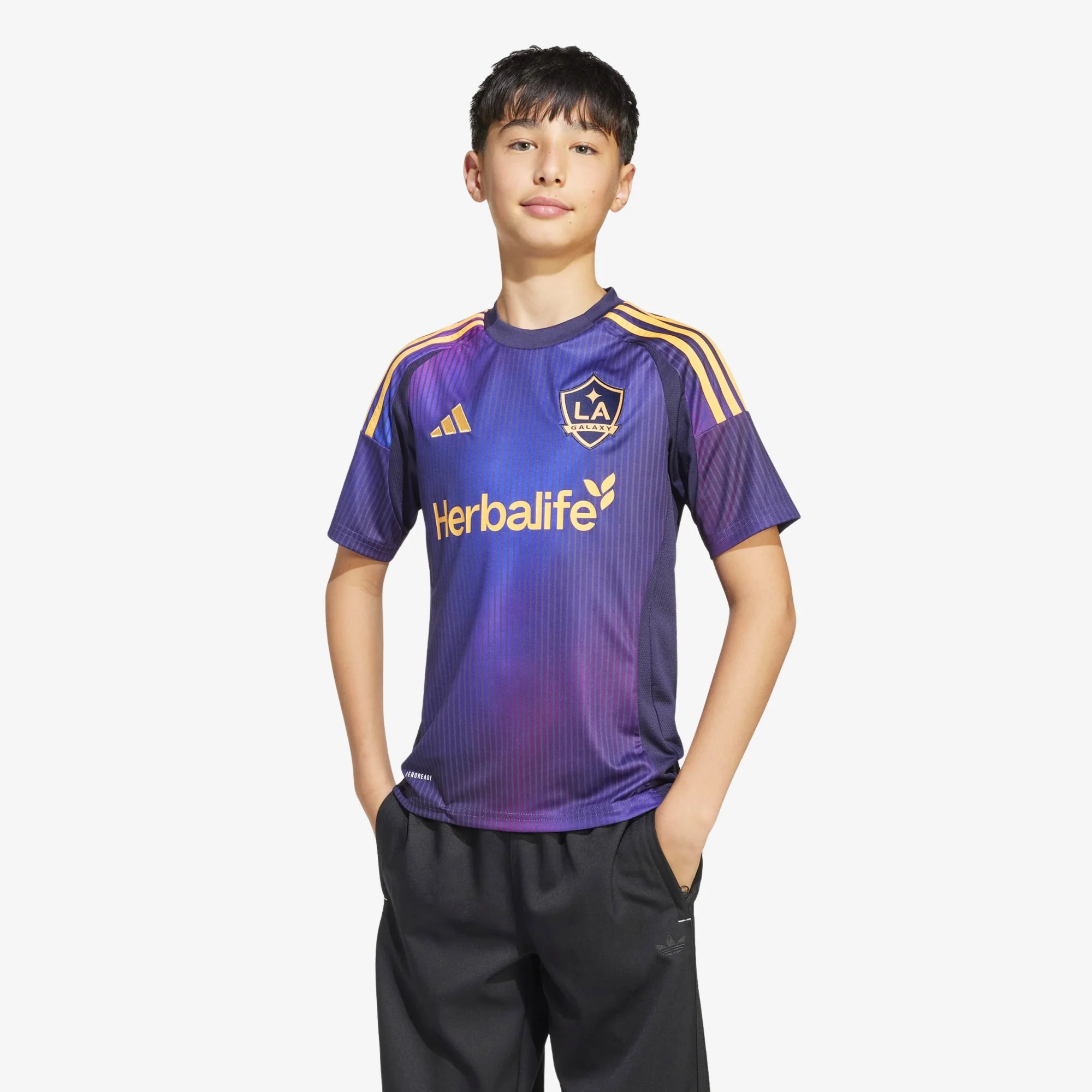 Built to shine, this juniors' adidas LA Galaxy away jersey displays the radiant hues of a spectacular Los Angeles sunset. Soft fabric and moisture-managing AEROREADY combine to keep you comfortable while you shout for your soccer heroes. An embroidered badge and special sign-off ensure your fandom remains front and center.